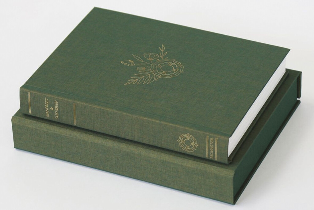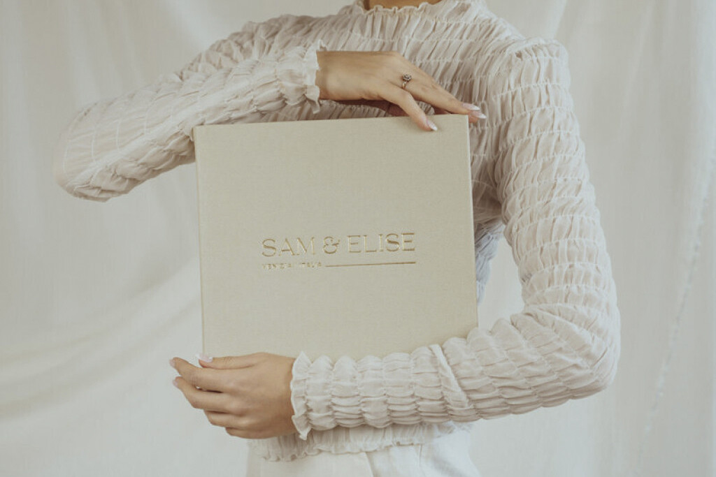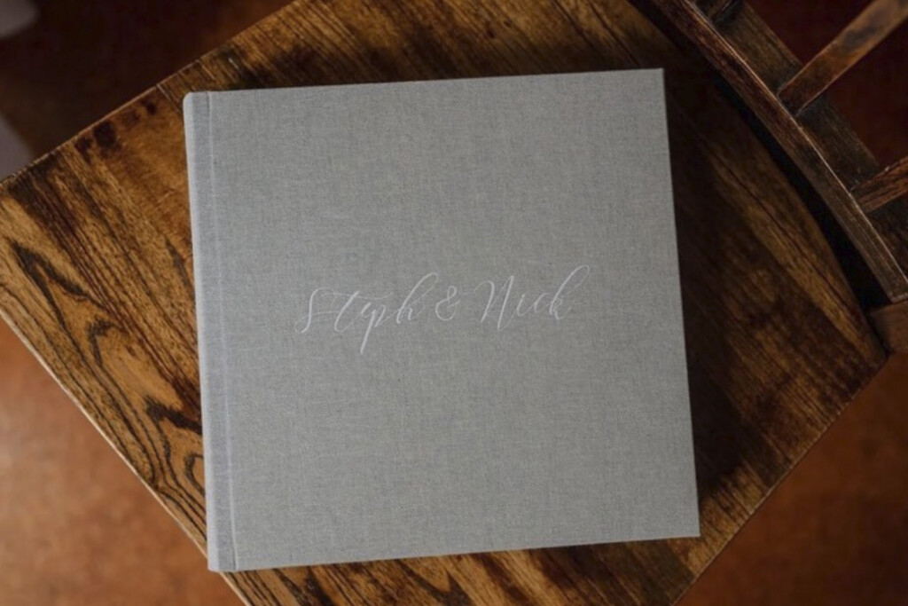 10x10 Flushmount in Pebble Linen with a white foil custom embossing, silver halide lustre printing