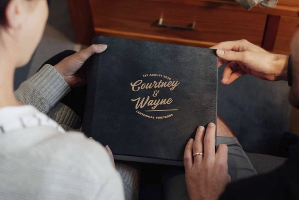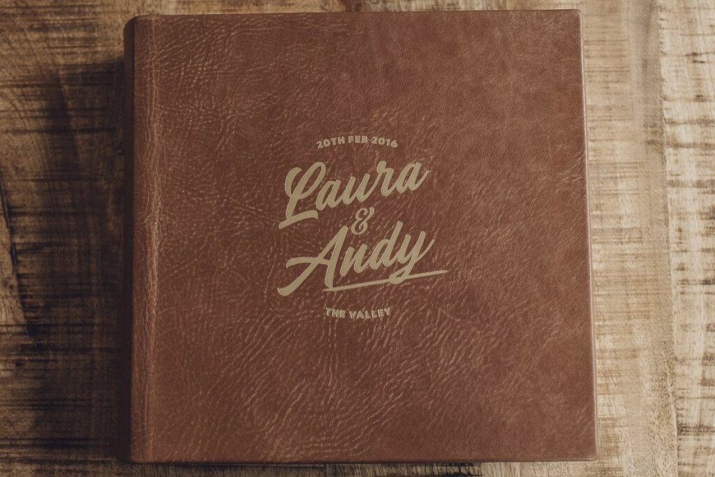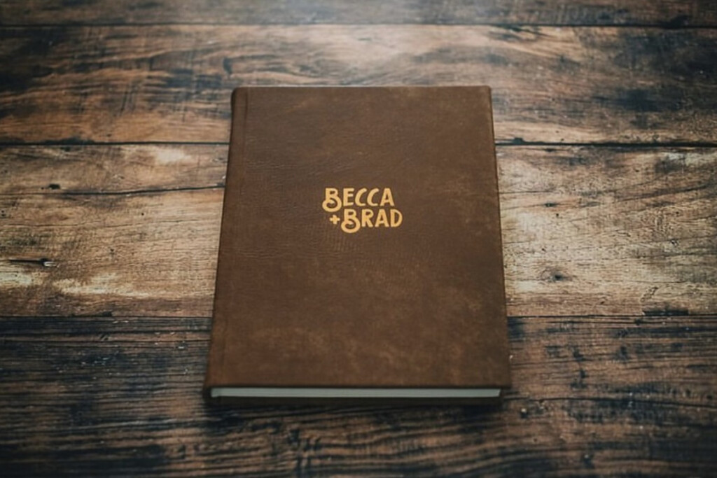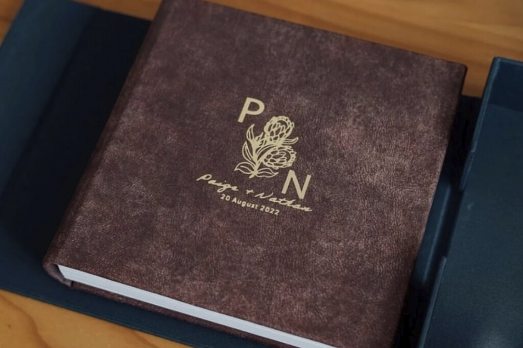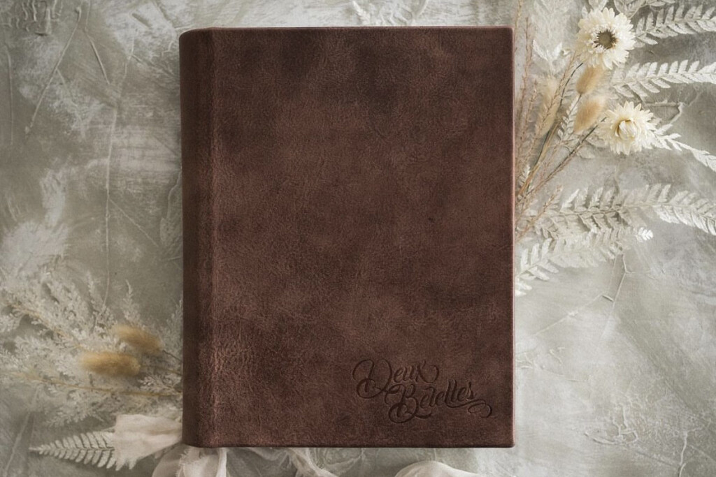10x10 Flushmount in Outback Vintage Leather with a gold foil custom embossing