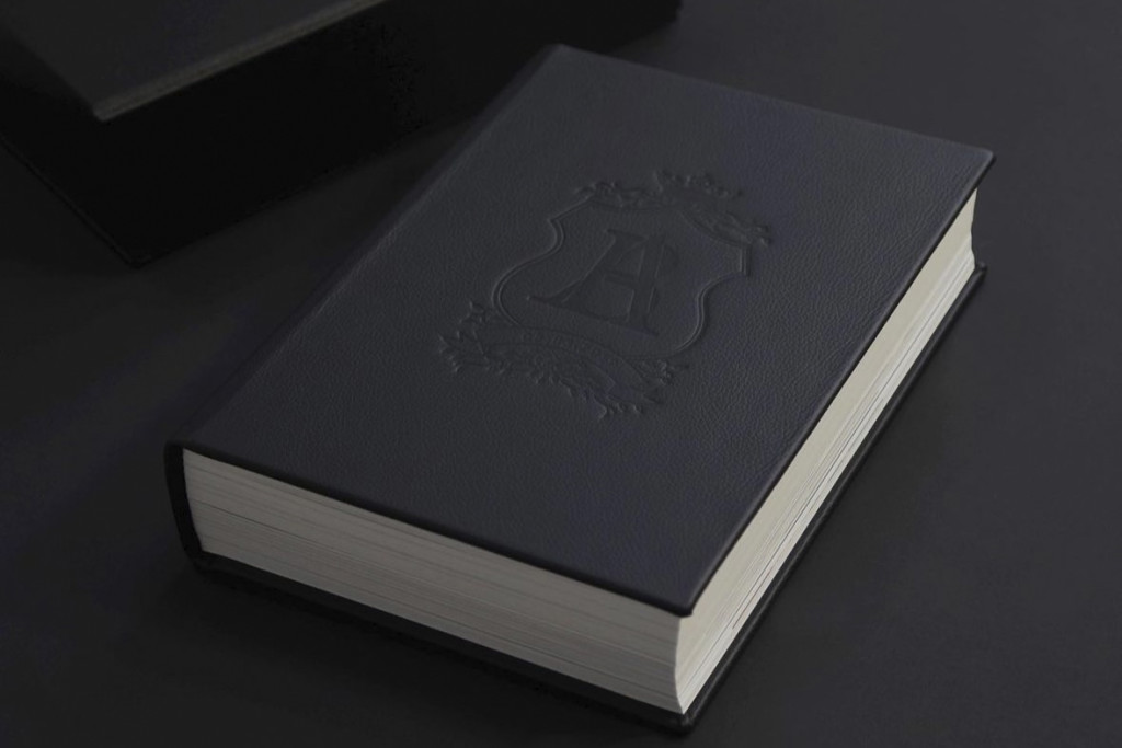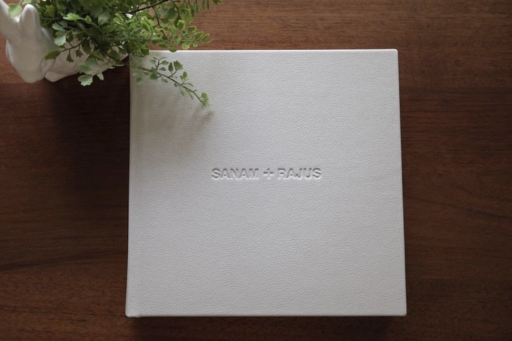 10x10 Flushmount in Eggshell Micro Leather with a blind embossing in helvetica