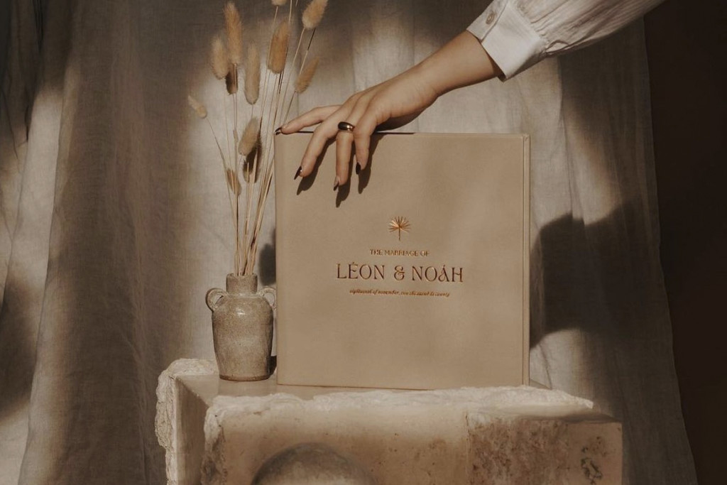 10x10 Flushmount in Eggshell Micro Leather with a gold foil custom embossing