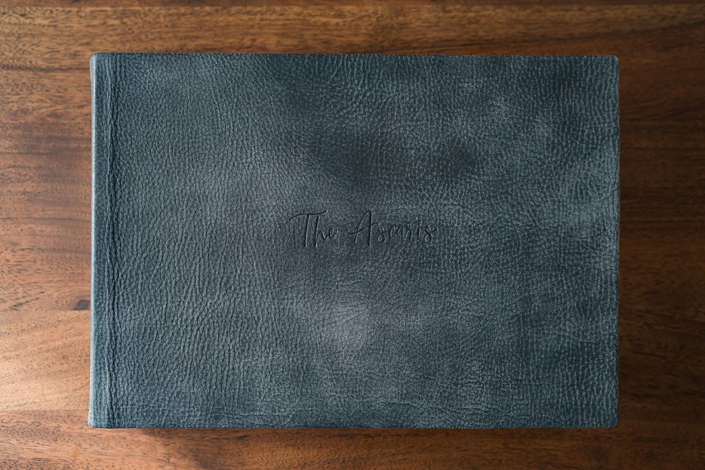 10x10 Flushmount in Storm Leather with a gold foil custom embossing