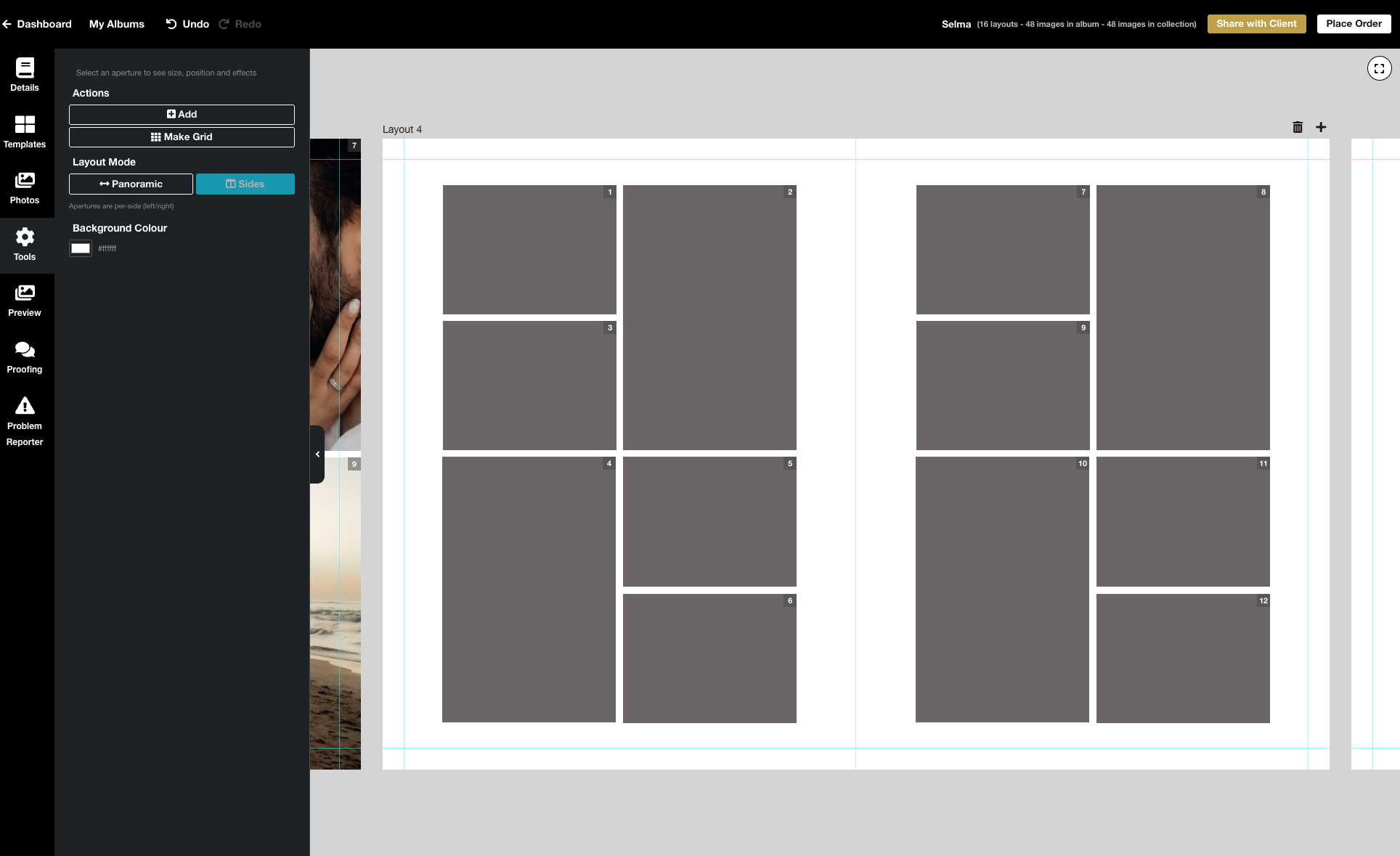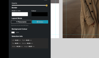 Think of the grid function as like building templates “on the fly“ — a handy shortcut when your existing template library doesn’t have what you need. Specify whether you want the grid to appear on the left or right side of the layout, or across the whole page opening in a panorama design. State how many images you want across the grid and how many down. It will populate the apertures with the photos if you already have them on the page, or otherwise add blanks.