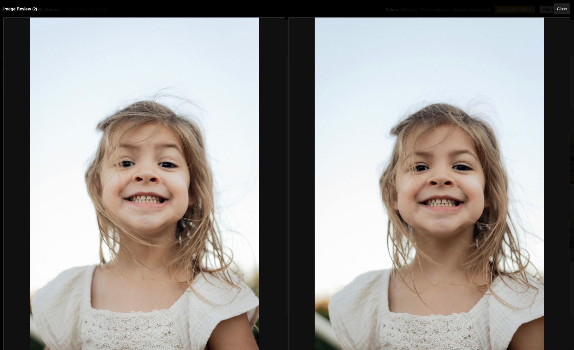 Compare images side by side to see which image you'd like to use in the album design. Simply click on the images in the photo panel, then click your space bar to open up the enlarged images side by side.