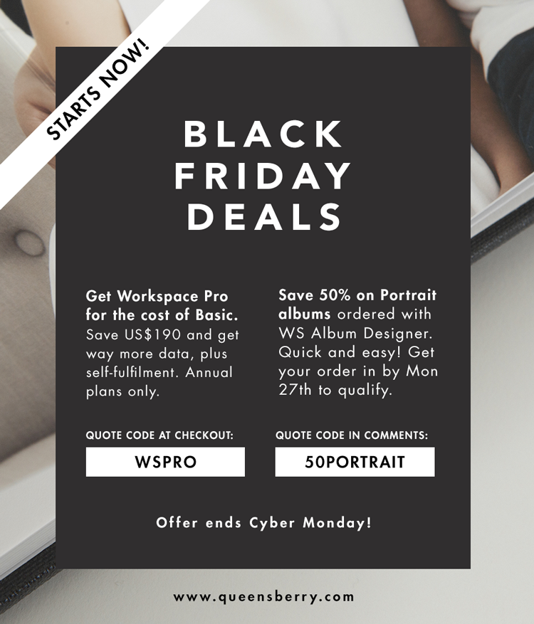 Yesterday we released a sneak peak of our new Client Gallery store. Today it's our 2020 Black Friday Sale. For the next 48 hours you can save 50% on Workspace annual plans with the following codes: 50% off Pro annual plans using code BLACKFRIDAYPRO (usually 290 USD now 145USD) 50% off Basic annual plans using code BLACKFRIDAYBASIC (usually 100USD now 50USD) Workspace is free to order products wholesale from Queensberry and to design and proof albums, but you can unlock a whole lot more with just one, affordable paid subscription. Beautiful client galleries To View More >>