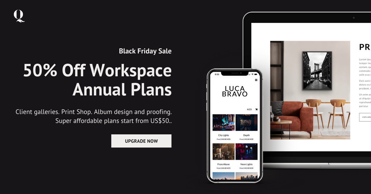 Yesterday we released a sneak peak of our new Client Gallery store. Today it's our 2020 Black Friday Sale. For the next 48 hours you can save 50% on Workspace annual plans with the following codes: 50% off Pro annual plans using code BLACKFRIDAYPRO (usually 290 USD now 145USD) 50% off Basic annual plans using code BLACKFRIDAYBASIC (usually 100USD now 50USD) Workspace is free to order products wholesale from Queensberry and to design and proof albums, but you can unlock a whole lot more with just one, affordable paid subscription. Beautiful client galleries To View More >>