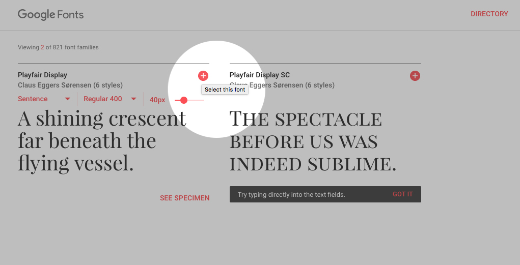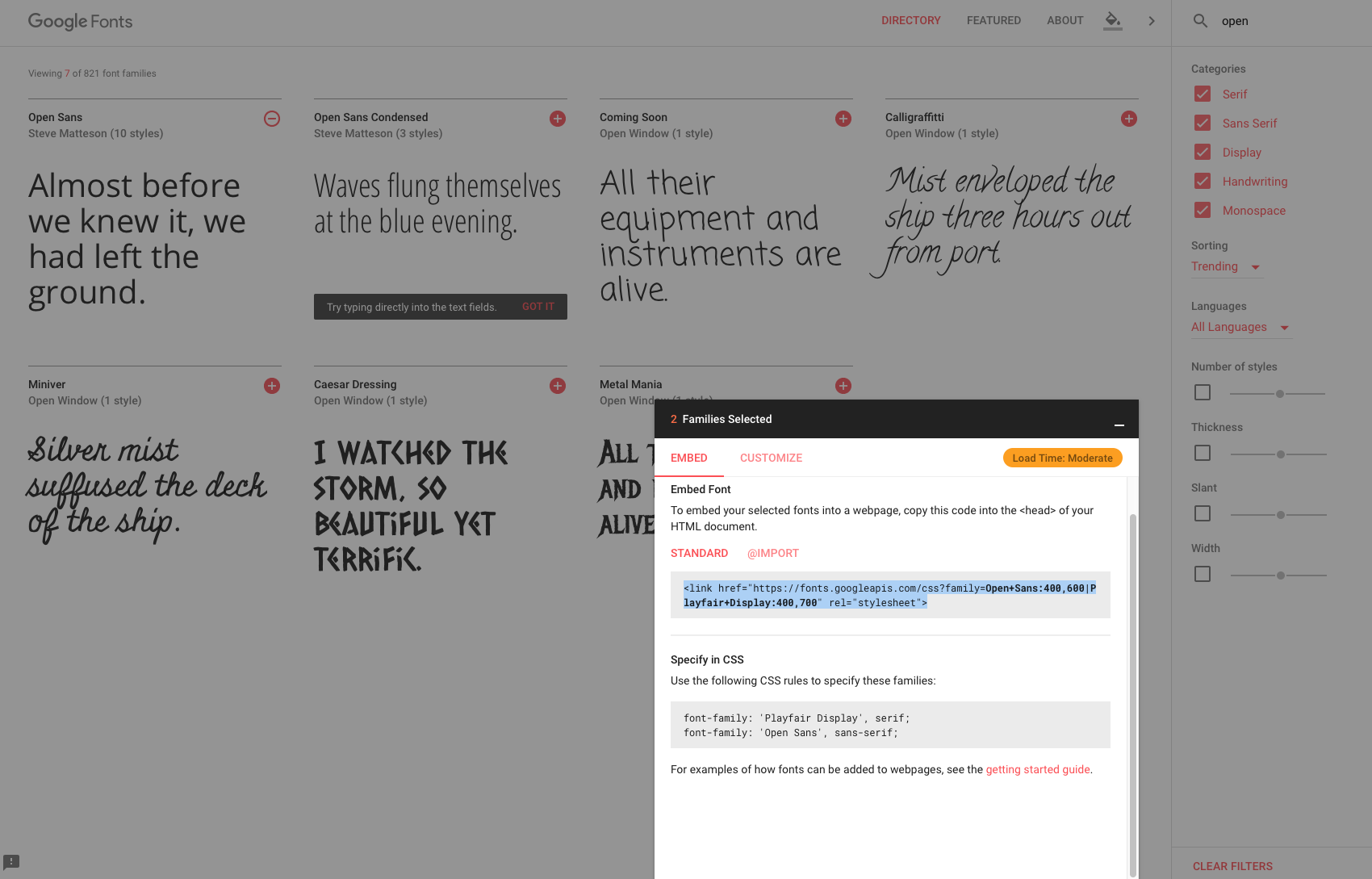 Head on over to Google fonts and browse through the library. When you find the font that you like, click on the “plus sign” button in the top right-hand corner. You can add multiple fonts to your collection. In this tutorial, I will be adding Playfair display as my header (h1) and open sans as the body text (p tag)