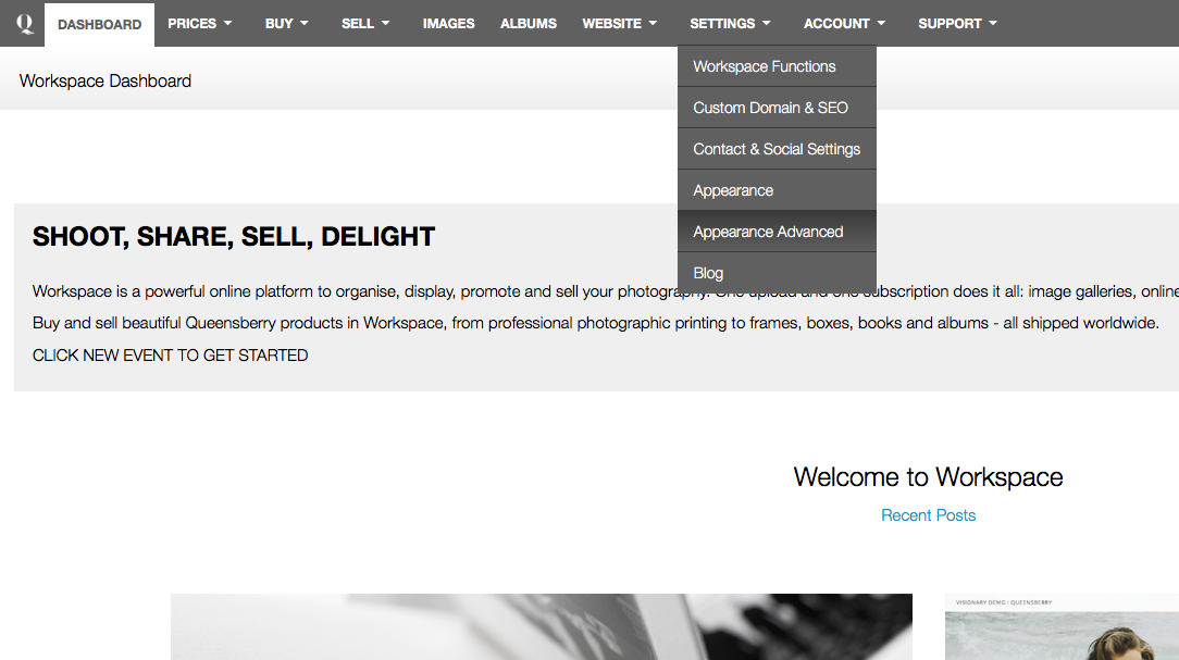 Copy the code in the standard section as highlighted in the screenshot above. You will then need to go to Workspace and click “appearance advanced” under the settings menu in Workspace.
