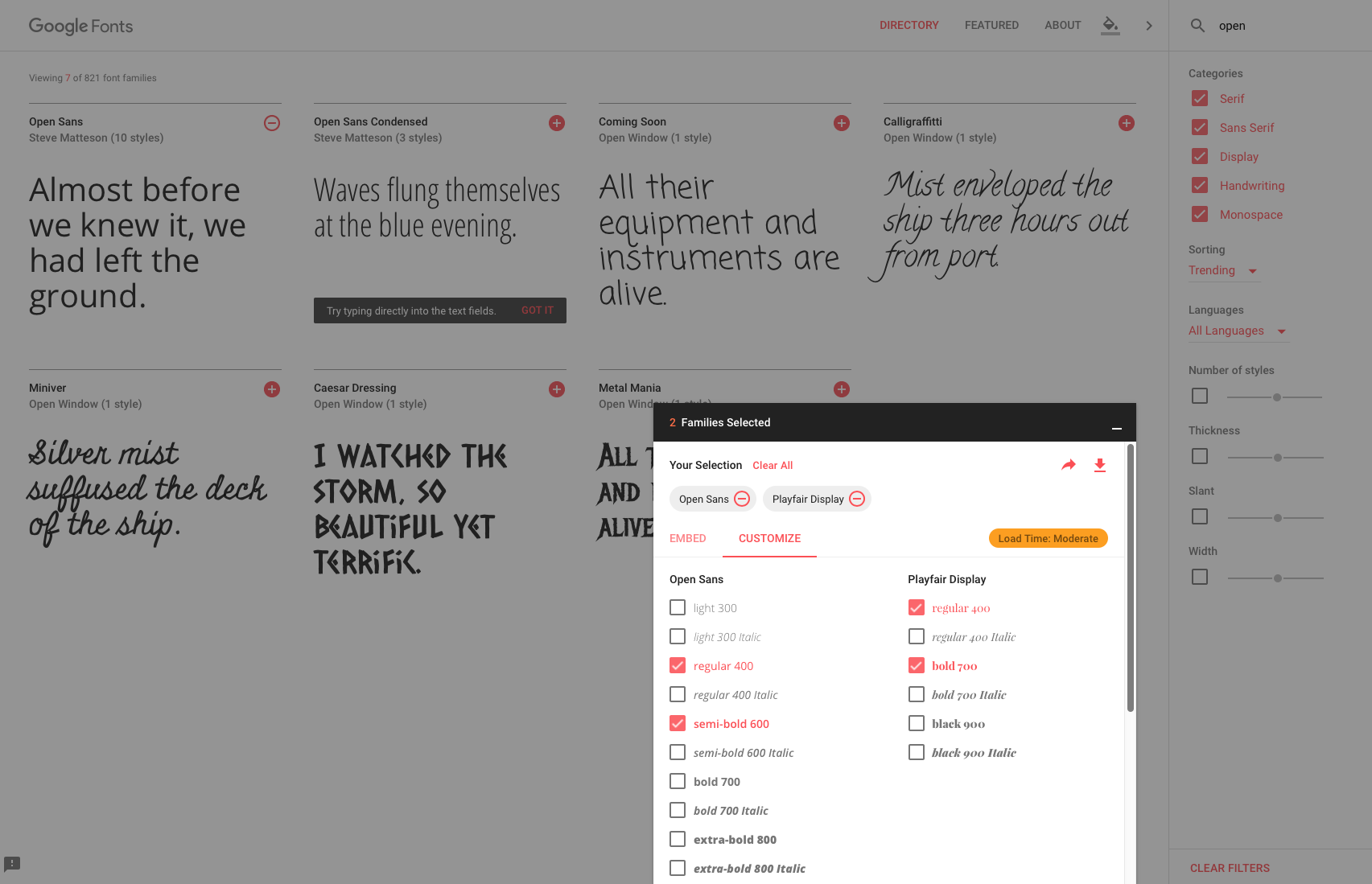 Once the fonts are added to your collection, open the panel at the bottom, to customise the weights and styles you want to add to your website. There is a customise tab, where you can select font-weights, styles and this will automatically update the small bit of code you will need to add to your website.