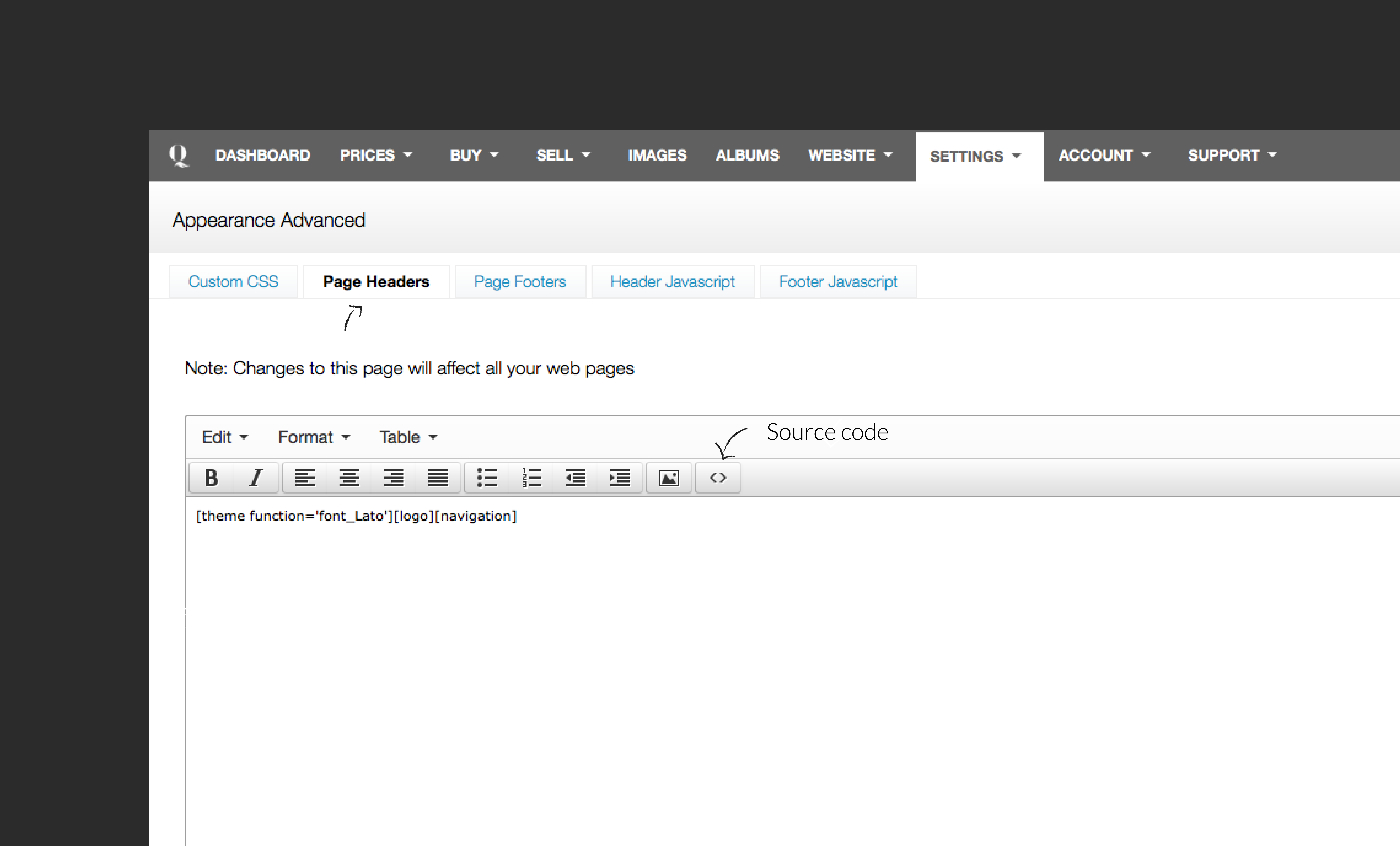 Click on the page headers tab, open up the source code and copy the text into there, save that. Then go back to google fonts and copy the style for each font. You will go back to Workspace and add these into the custom CSS. Add the following code (replace with your styling).